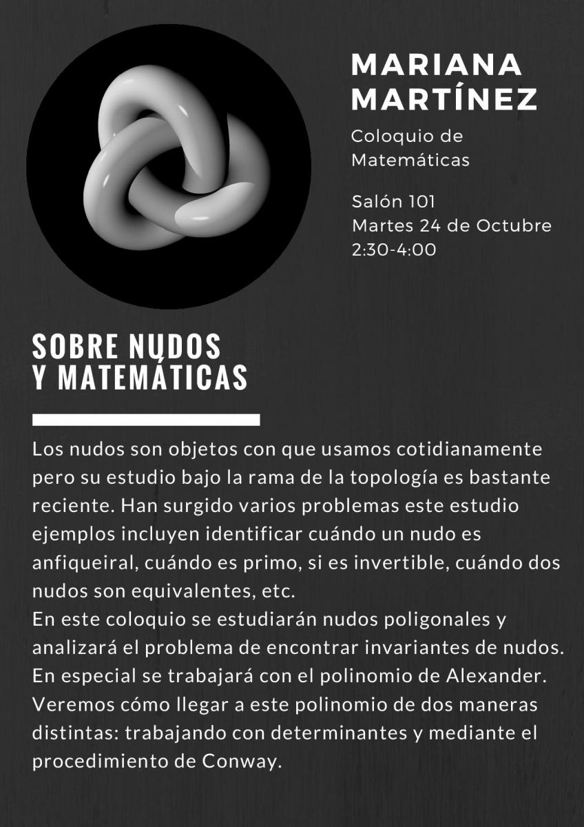 En este coloquio se estudiarán nudos poligonales y analizará el problema de encontrar invariantes de nudos. En especial se trabajará con el polinomio de Alexander. Veremos cómo llegar a este polinomio de dos maneras distintas: trabajando con determinantes y mediante el procedimiento de Conway.